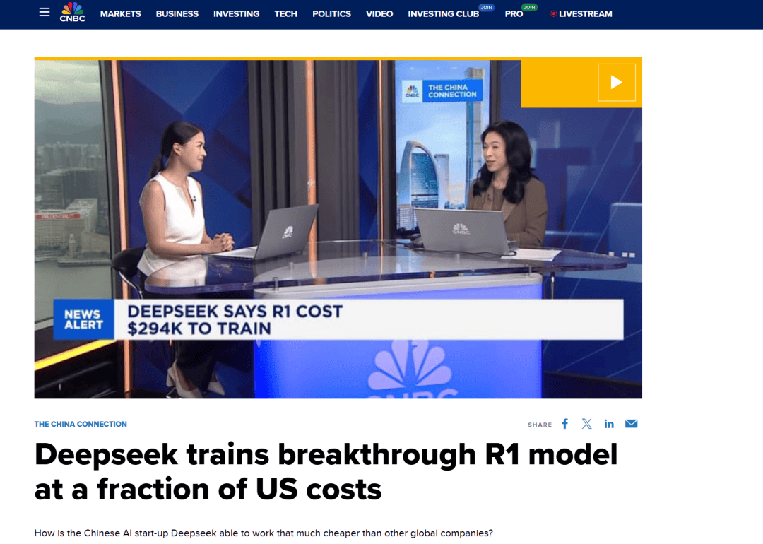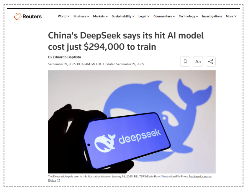 CNBC 甚至评论,DeepSeek用这笔钱就完成了原本只有超级大厂才敢碰的训练量,打破了“必须拥有最顶尖 GPU 才能玩 AI”的假设。