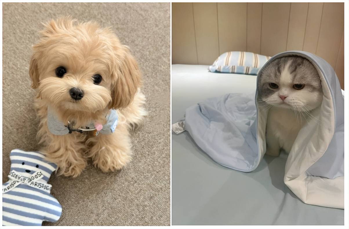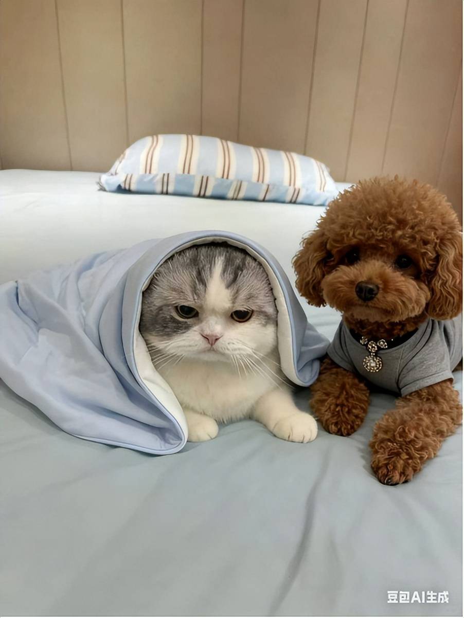 为了验证多图融合能力,我们上传了一猫一狗两张宠物照片,并输入提示词:将图 1 狗狗和图 2 猫咪合进一张画面。