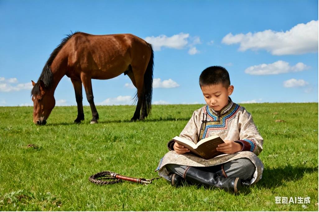 我们对这一生成能力也进行了测试,在对话框输入指令:一个亚洲少数民族男孩,坐在草地上看书,身边放着马鞭,草地上有一匹马在吃草,天空是清透的蓝天白云,构图为3:2横图,风格为写实摄影。